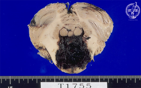 Macroscopic findings (pontine hemorrhage): The pontine was massively swollen by hematomawhich is also detected in the fourth ventricle.