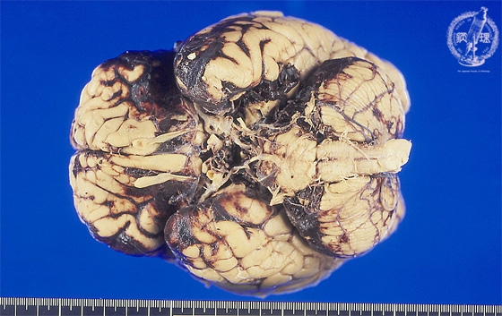 Macroscopic findings: Extensive dark brown colored hemorrhage was detected in the subarachnoidal space of the brain base. Hematoma was identified around the circle of Willis and sylvian fissure, and thin coated hemorrhage was also detectd in the base of frontal lobe, the pole of lateral lobe, and the anterior portion of cerebellum.