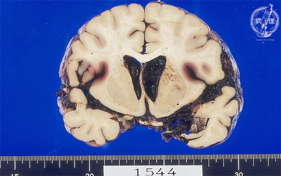 Macroscopic findings: Dark brown colored hemorrhage was identified in the brain base and bilateral sylvian fissures, and the hematoma also detected in both lateral ventricles. Destruction of the brain parenchyma followed by extensive hemorrhage into both lateral ventricles was caused by elevated blood pressure when the aneurysm ruptured.