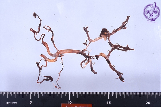 Macroscopic findings: An aneurysm was detected in the bifurcation of the right internal carotid and median cerebral arteries (arrow), with hematoma followed by rupture of the aneurysm.
