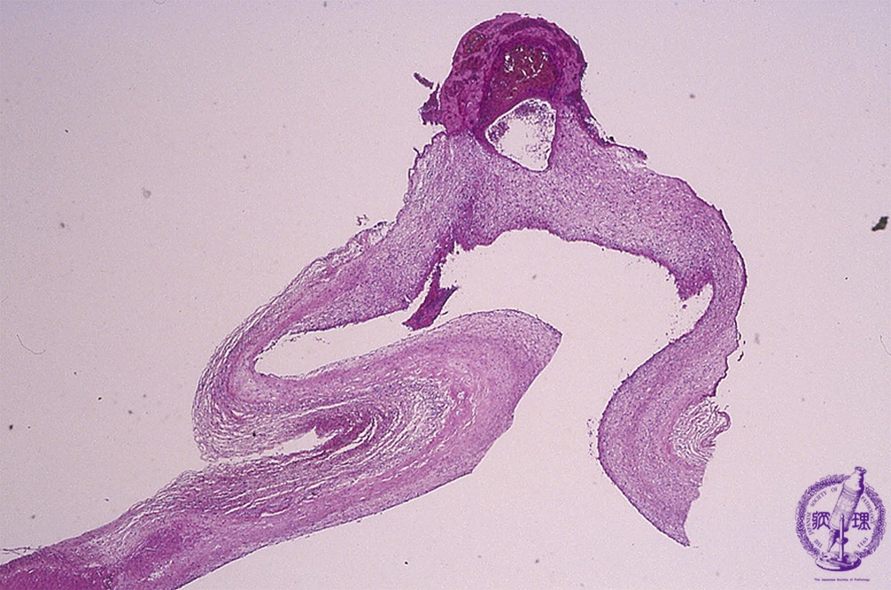 Microscopic findings (H.E. low magnification): Cystic dilatation and thinness of the brain arterial wall is visible. The wall was ruptured in part and the defect of tunica media and fibrin thrombi identified in the wall.