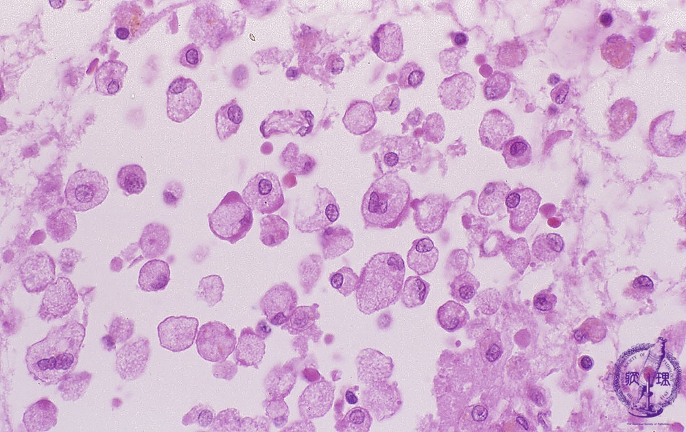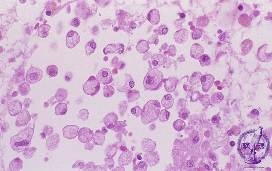 Microscopic findings (H.E. high magnification): Macrophages demonstrated foamy appearance by phagocytosis of the lipid-rich necrotic debris.