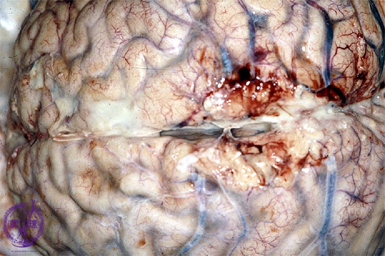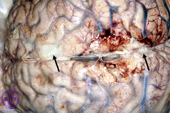 Macroscopic findings: The arachnoidea was clouded and abscesses were also identified(arrows).