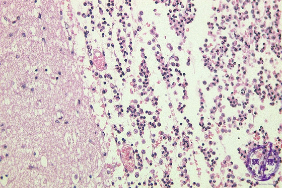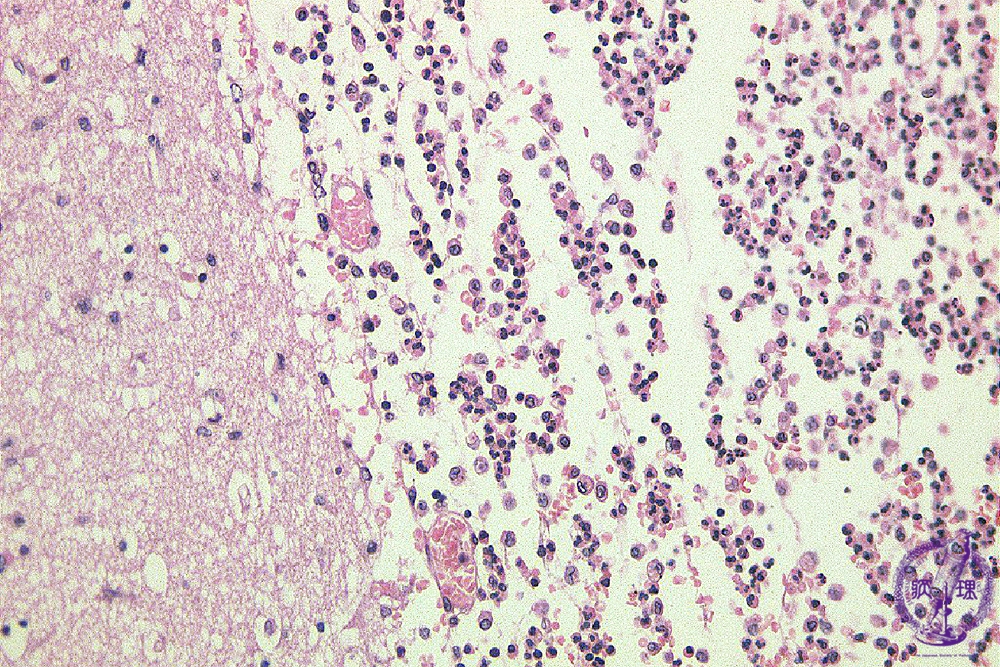 Microscopic findings (H.E. high magnification): Infiltrating inflammatory cells were mainly neutrophils and macrophages.