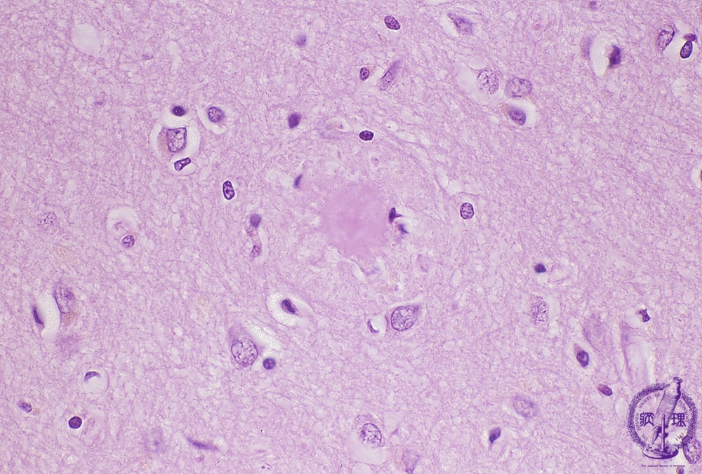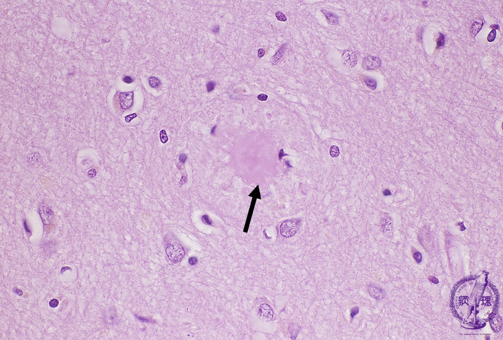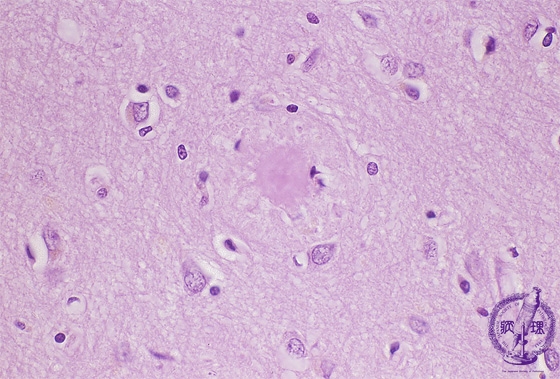 Microscopic findings (H.E. high magnification): Senile plaques detected in the cerebral cortex (arrow). An eosinophilic amyloid core detected in the center of plaque, surrounded by dystrophic neurites.