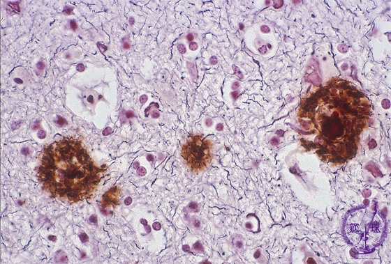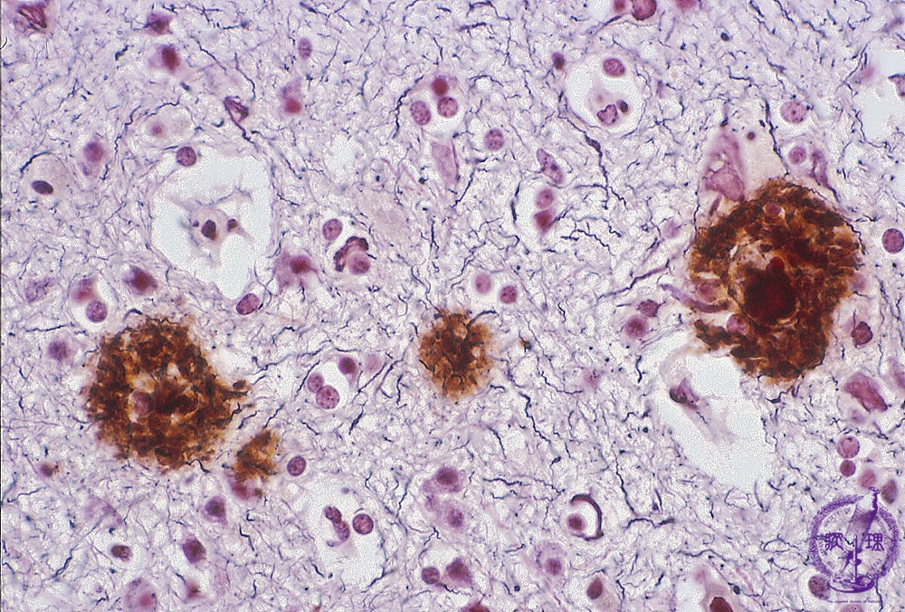 Microscopic findings (Bodian staining and amyloid protein immunistaining): Three various sized senile plaques detected which were immunihistochemically positive for -amyloid protein. Wavy fibrils were neuropil thread in silver staining.