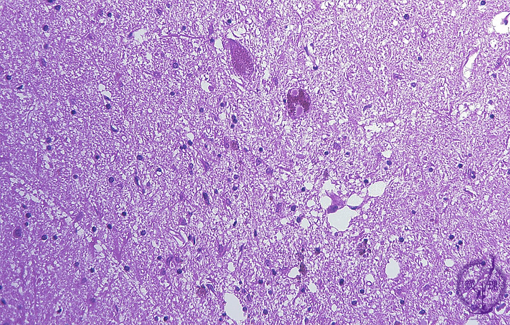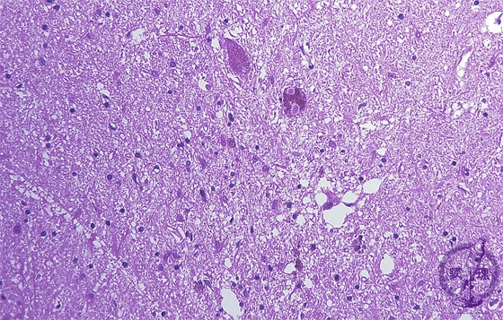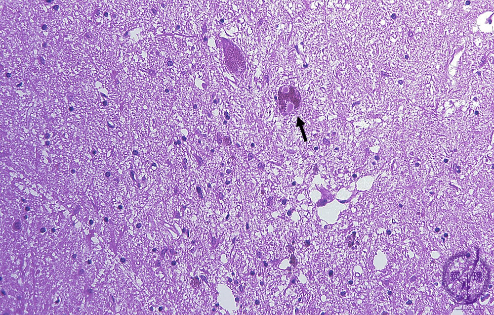 Microscopic findings (H.E. middle magnification): Melanin-containing neurons of substantia nigra were decreased in number and remaining neurons contained Lewy bodies in their cytoplasm (arrow). Melanin pigmentation identified in the substance of the areas in which neurons disappeared.