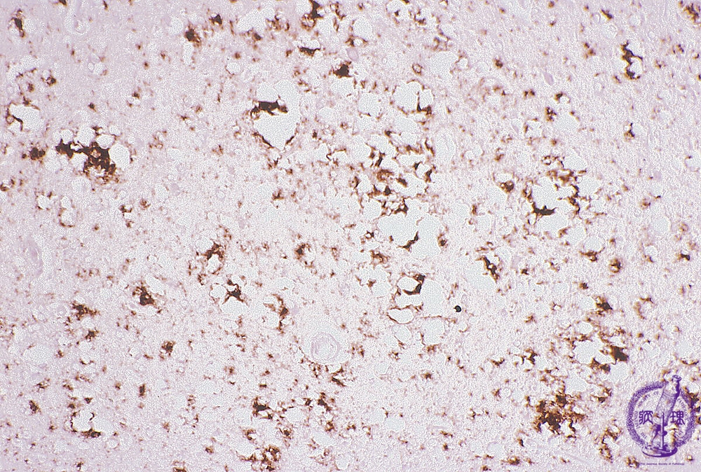 Microscopic findings (prion protein immunostaining): Immunohistochemically, prion proteins were diffusely and extensively deposited in the remaining brain tissue.
