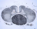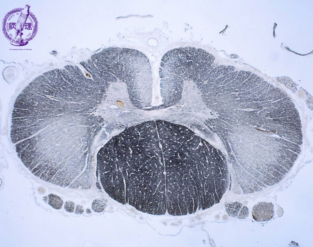 Microscopic findings (Kultschitzky staining): Marked symmetrical demyelination (whitening regions) was detected in the anteriolateral roots (especially pyramidal tract) of the spinal cord (arrows). The posterior roots were well preserved.