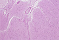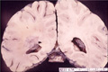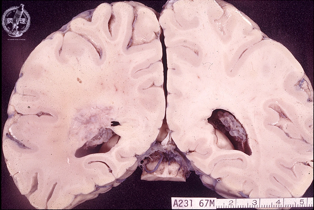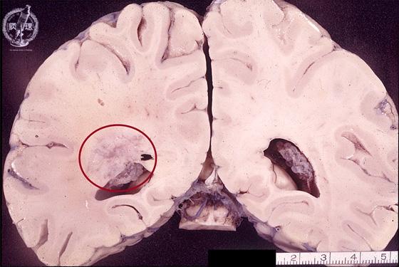 Macroscopic findings: Relatively indistinct tumor mass was detected in the lateral lobe around the left lateral ventricle (red circle).