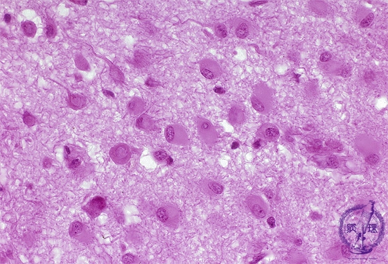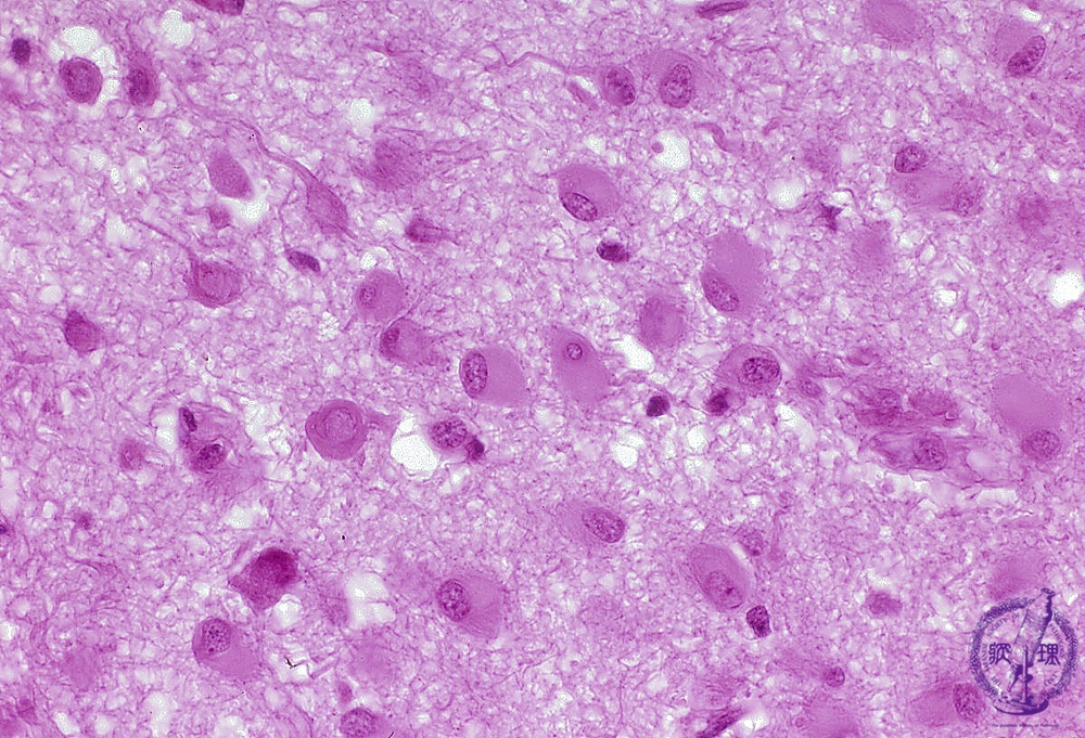 Microscopic findings (H.E. high magnification): Gemistocytic astrocytoma demonstrated a proliferation of astrocyte-like tumor cells with eccentric rounded nuclei and eosinophilic ground-glass like large cytoplasms. Some tumor cells demonstrated elongation of thick neurites.
