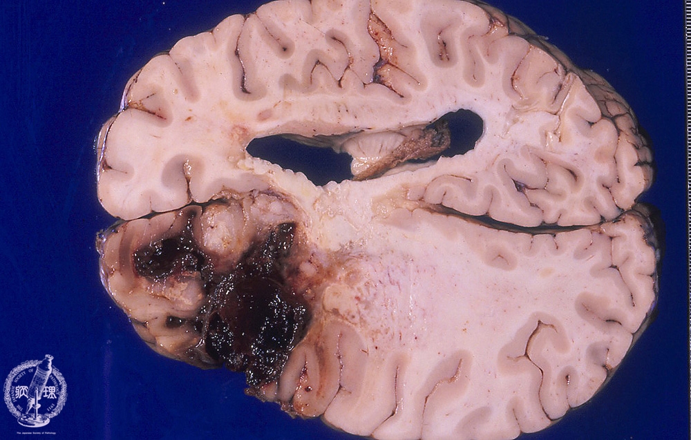 Macroscopic findings: A hemorrhagic and necrotic tumor mass was detected in the left frontal lobe. Left brain was swollen by surrounding edema and the midline was deviated to the left side. Left lateral ventricle could not be seen because of the downward compression.