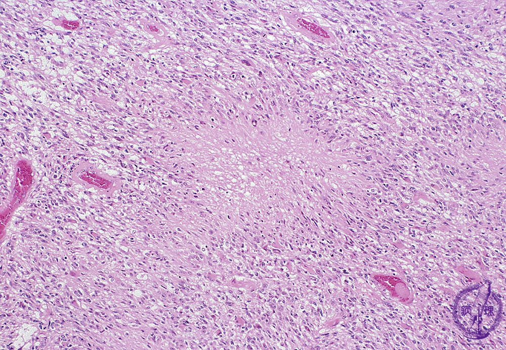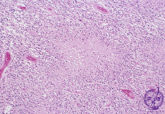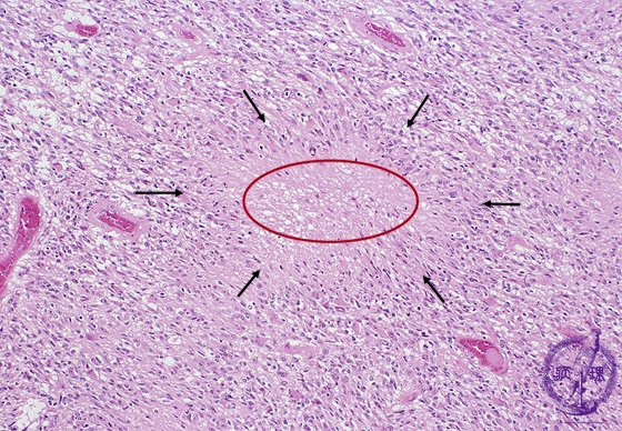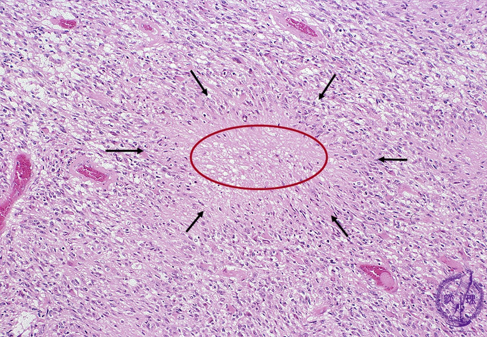 Microscopic findings (H.E. middle magnification): Central coagulation necrosis (red circle) surrounded by palisading assignment of tumor cells (arrows) had characteristic histological findings of glioblastoma, namely ‘palisading necrosis’.