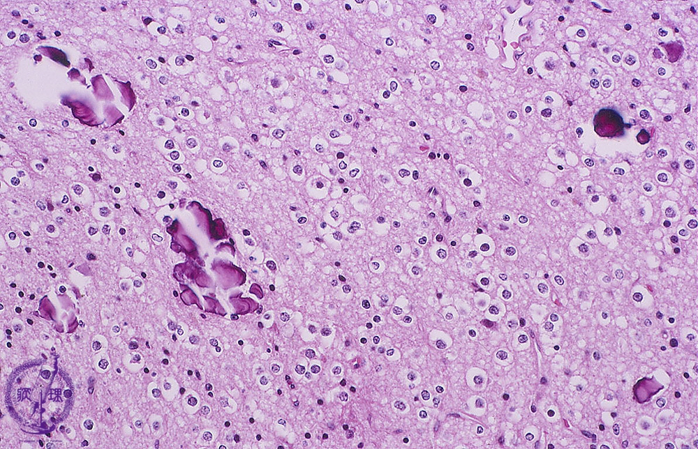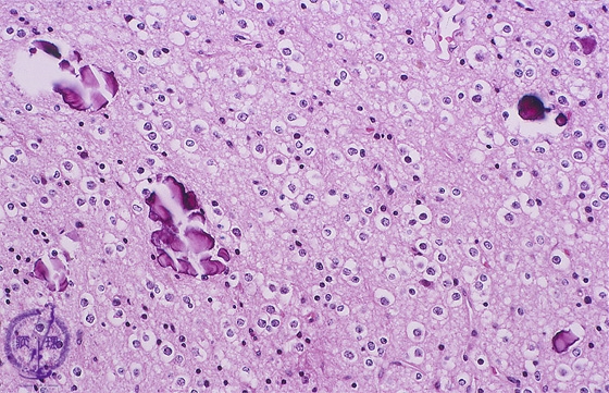 Microscopic findings (H.E. low magnification): Oligodendroglioma demonstrated a diffuse proliferation of tumor cells with perinuclear halo and forms honey-comb like structures. Many calcified foci were also identified.