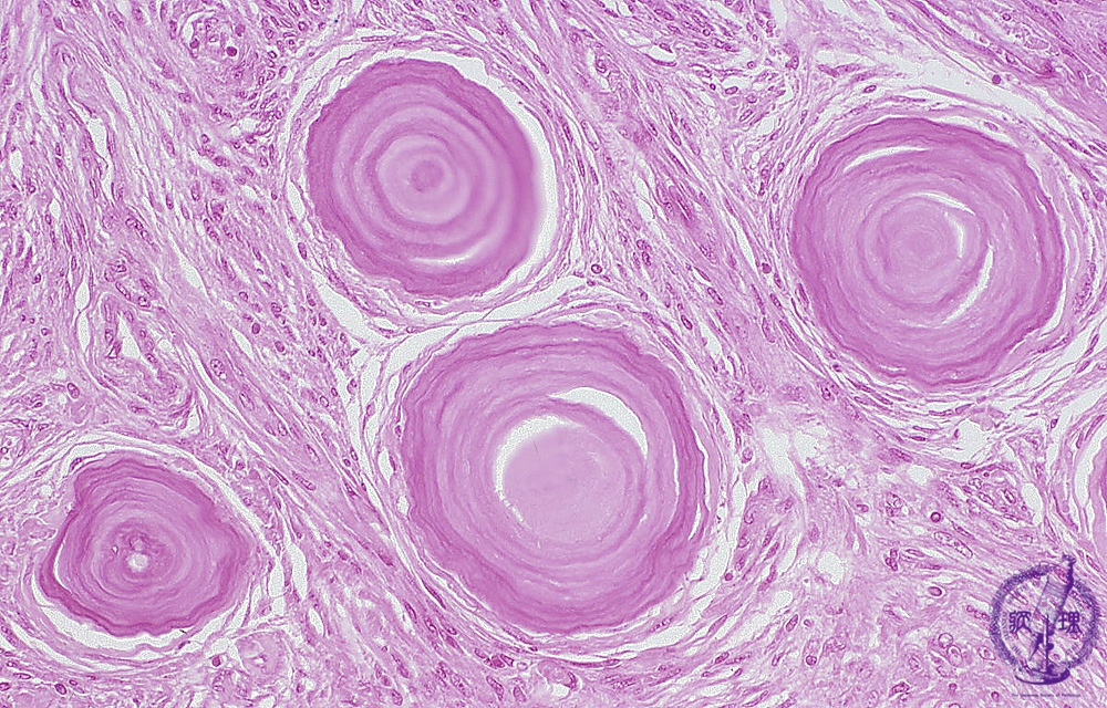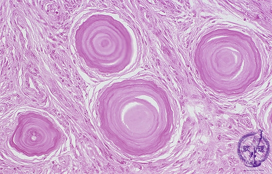 Microscopic findings (H.E. middle magnification): Psammomatous meningioma showed a proliferation of elongated tumor cells with fibrous bundles. Lamellar calcified bodies, namely psammoma bodies, were seen in a scattered fashion.