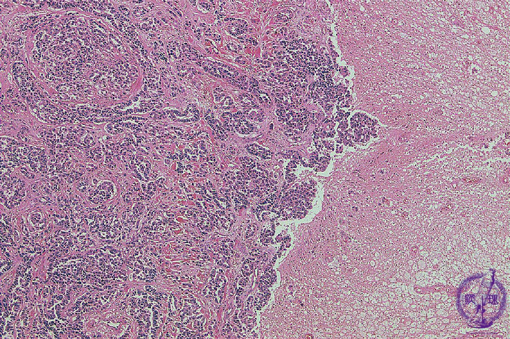Microscopic findings (H.E. low magnification): Atypical epithelial cells showing glandular structures invaded into the cerebral parenchyma, but the invasive front was clear.