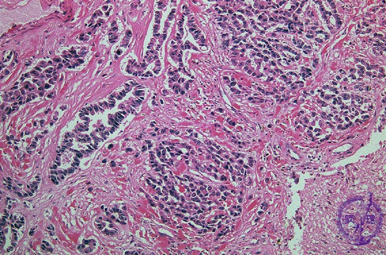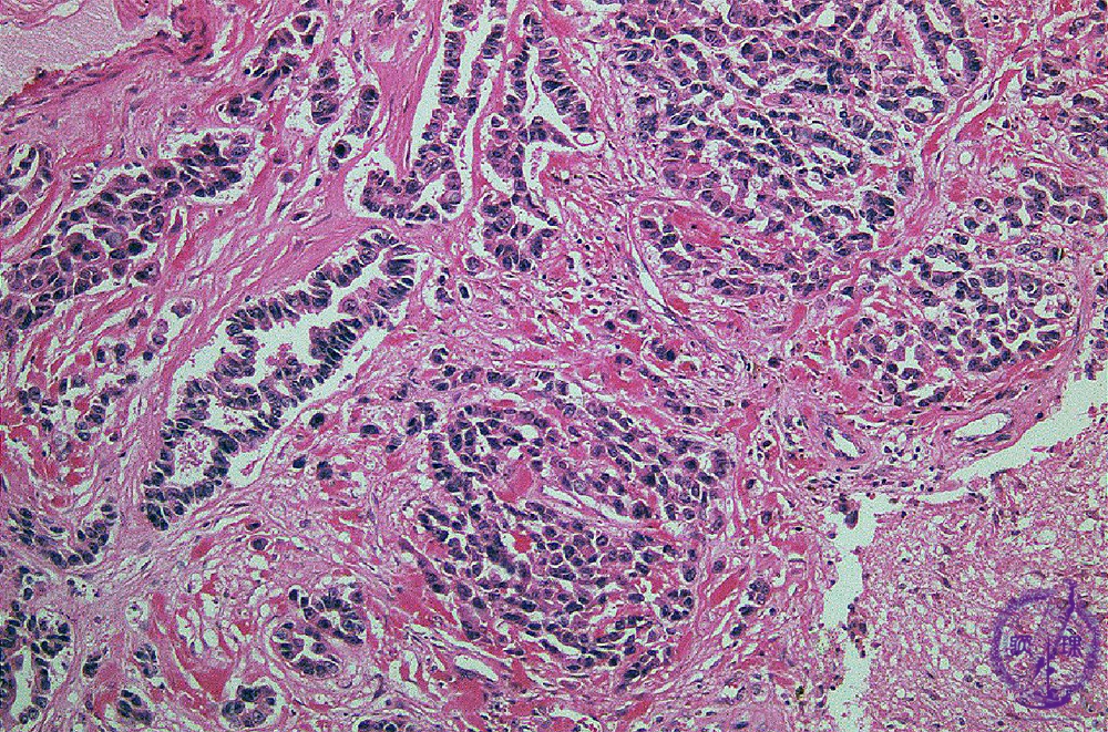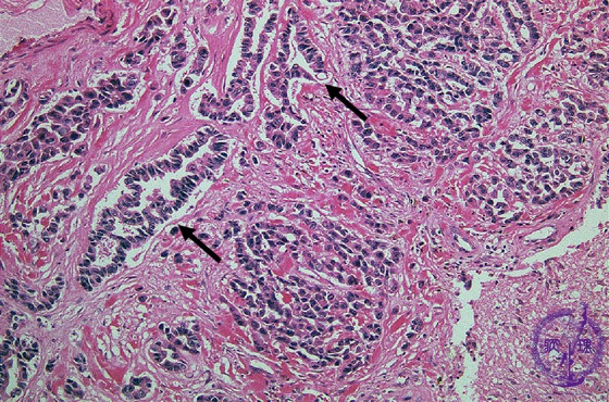 Microscopic findings (H.E. high magnification): Tumor cells showed apparent glandular structures (arrows), indicating the brain metastasis of adenocarcinoma (from lung).