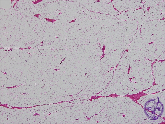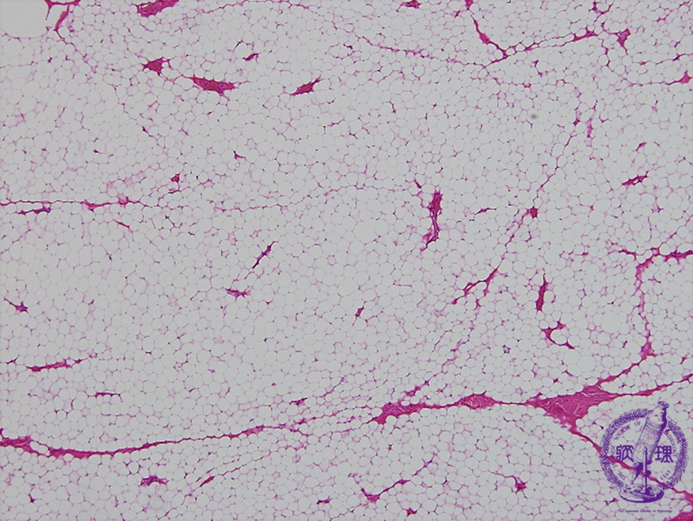 Microscopic findings (H.E. low power view): Lipoma composed of mature adipose tissue, indistinguishable from normal adipose tissue with light microscopy.
