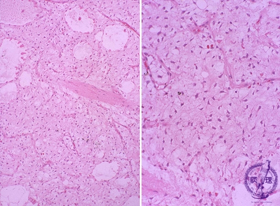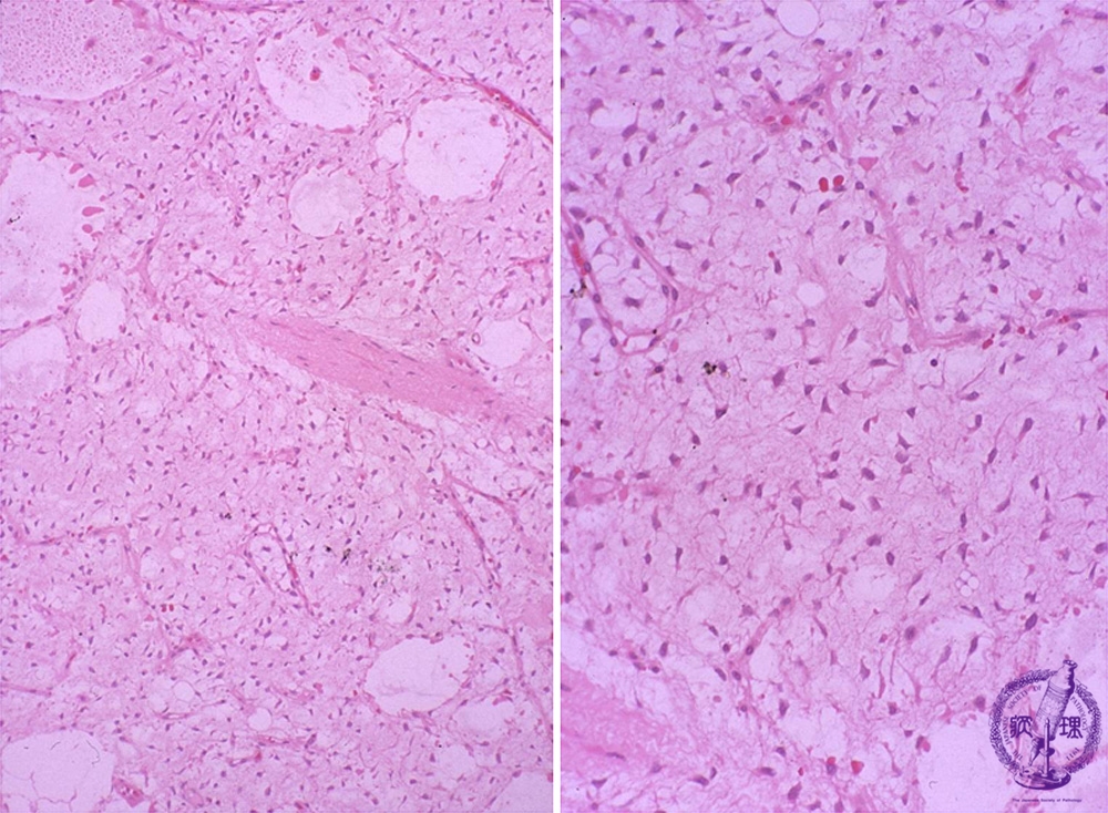 Microscopic findings (H.E. intermediate power view (left) and high power view (right)): A proliferation of tumor cells in the myxomatous stroma with complex brunching of capillaries (arrows).