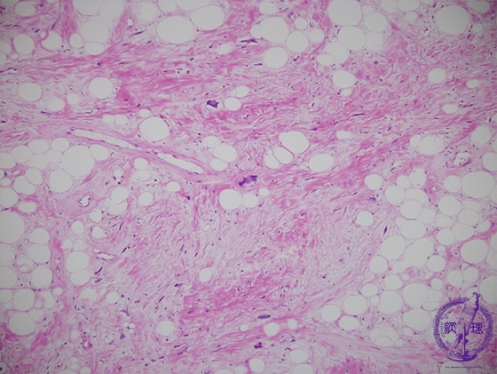 Microscopic findings (H.E. low power view): Hyalinized collagenous connective tissues identified within the fatty tissues.