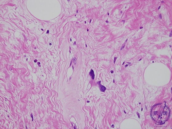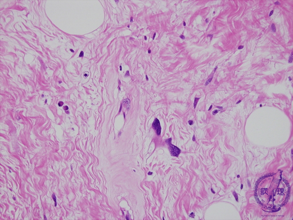 Microscopic findings (H.E. high power view): Hyperchromatic tumor cells with atypical nuclei scattered in the collagenous tissue.