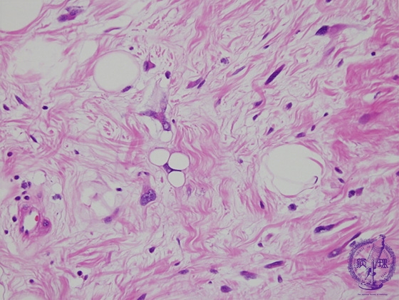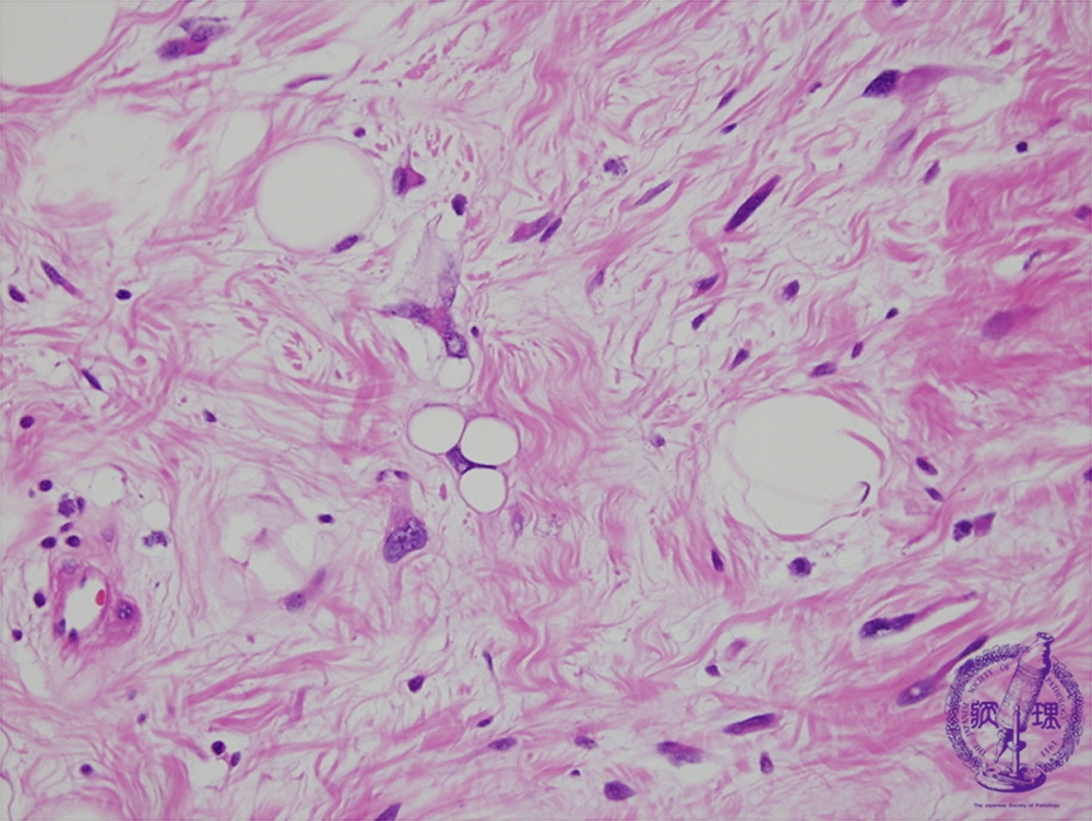 Microscopic findings (H.E. high power view): Tumor cells differentiated to adipocytes with fat droplets.
