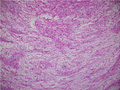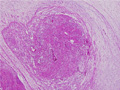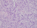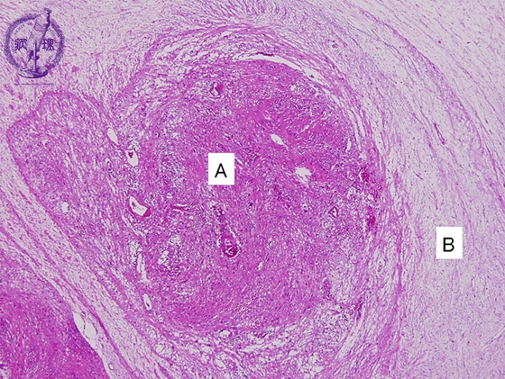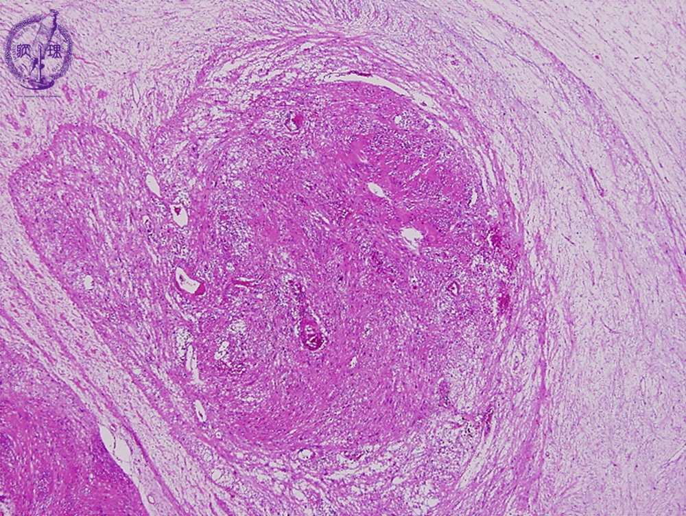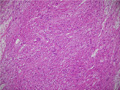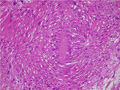 Microscopic findings (H.E. low power view): Thecoexistence of cellular Antoni A area associated with proliferation of spindle cells and edematous Antoni B area associated with scattered spindle cells.