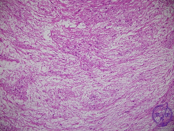 Microscopic findings (H.E. intermediate power view): In Antoni B area, spindle-shaped tumor cells scattered in the edematous or myxomatous background.