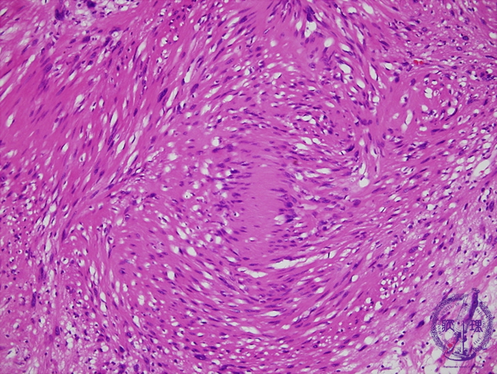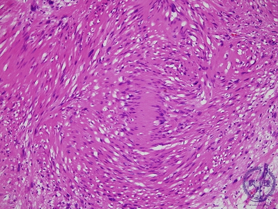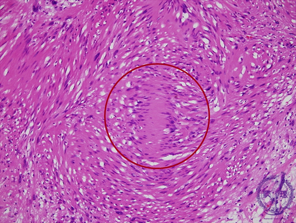 Microscopic findings (H.E. high power view): In Antoni A area, ball-like fibrous bundles with bipolar nuclear palisading, termed Verocay bodies, are also identified (red circle).