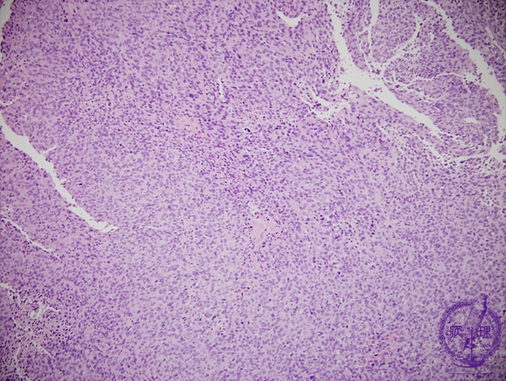 Microscopic findings (H.E. low power view): Spindle-shaped tumor cells proliferated without forming particular structures.