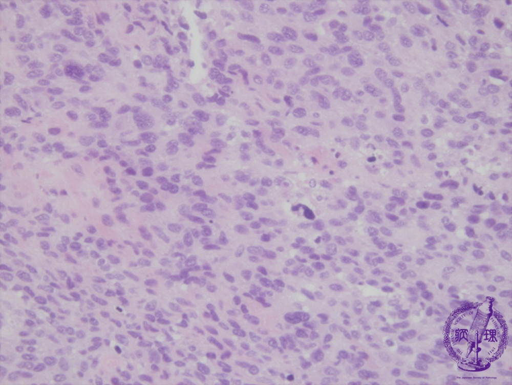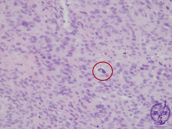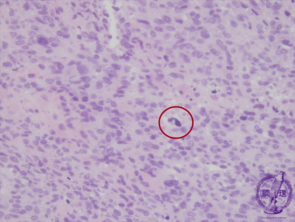 Microscopic findings (H.E. high power view): Spindle-shaped tumor cells markedly atypical with many mitotic figures and nuclear polymorphism, such as giant nuclei (red circle).