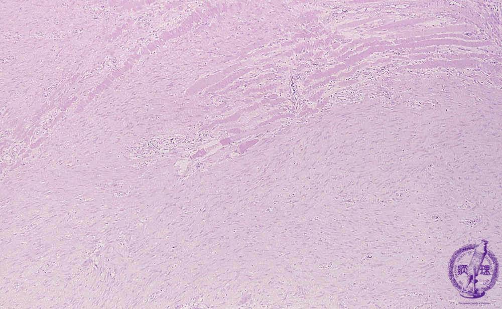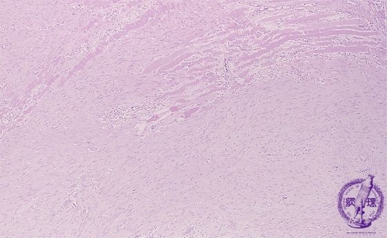 Microscopic findings (H.E. low power view): Spindle tumor cells demonstrated an infiltrative growth into the skeletal muscle tissue (upper). The margin of the tumor is unclear, and tend to recur.