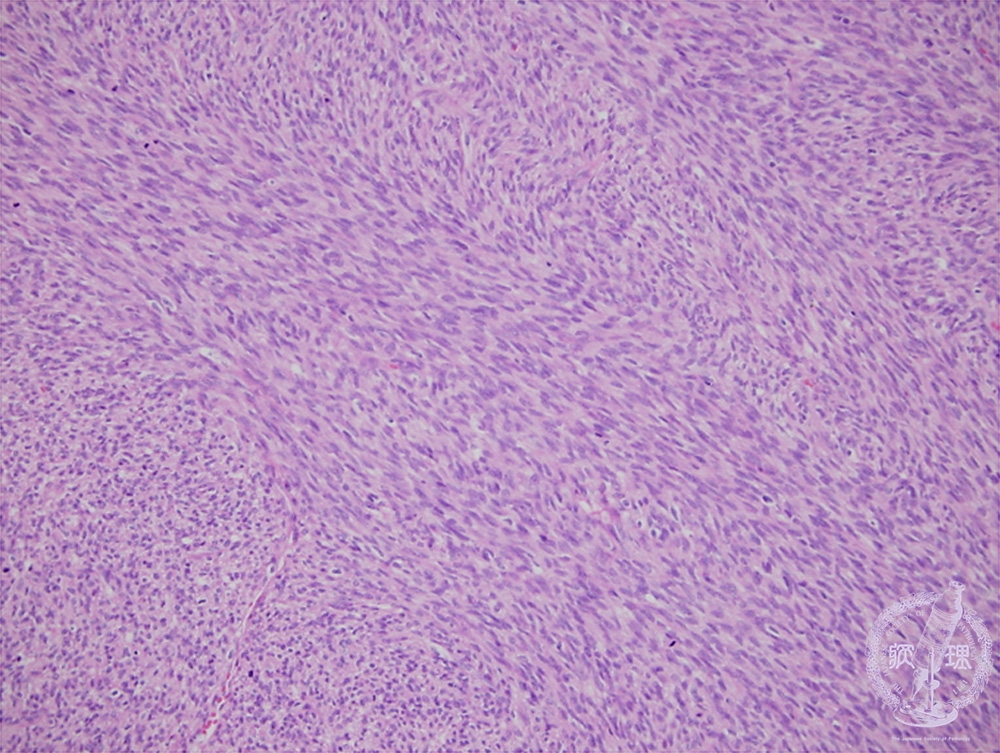 Microscopic findings (H.E. intermediate power view): Spindle-shaped fibroblastic tumor cells formed in a compact fashion.