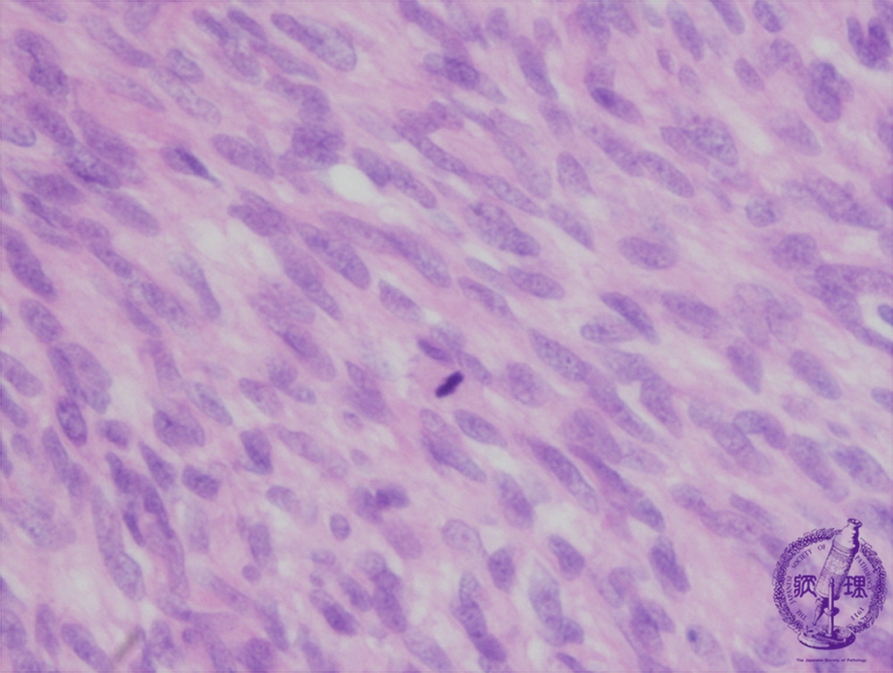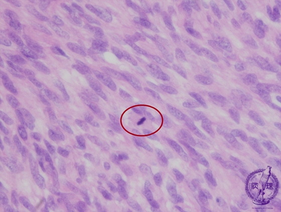 Microscopic findings (H.E. high power view): Cellularity of tumor cells abundant and many mitotic figures detected.