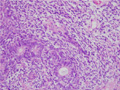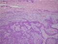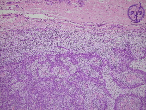 Microscopic findings (H.E. low power view): Synovial sarcoma arising in soft tissue around the major joints. Biphasic type with both mesenchymal (upper) and epithelial (lower) elements, but a monophasic type with an either element is also reported.