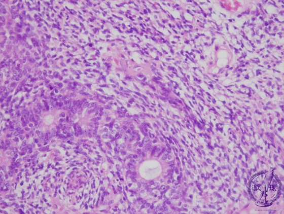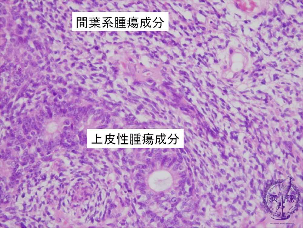 Microscopic findings (H.E. high power view): Tumor consisted of both epithelial and mesenchymal cells. Characteristic chromosomal translocation t(18;X) resulting in SYT-SSX fusion gene.