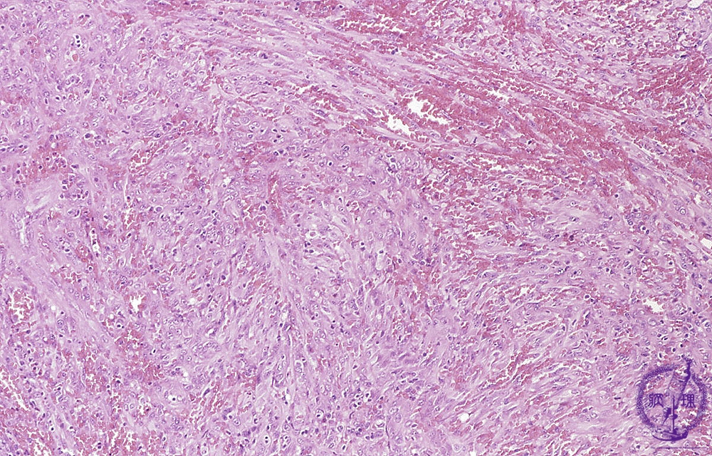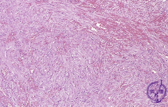 Microscopic findings (H.E. intermediate power view): Intercellular spaces contain red blood cells , mimicking blood vessels.