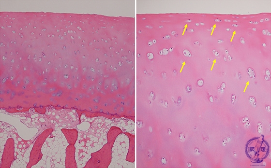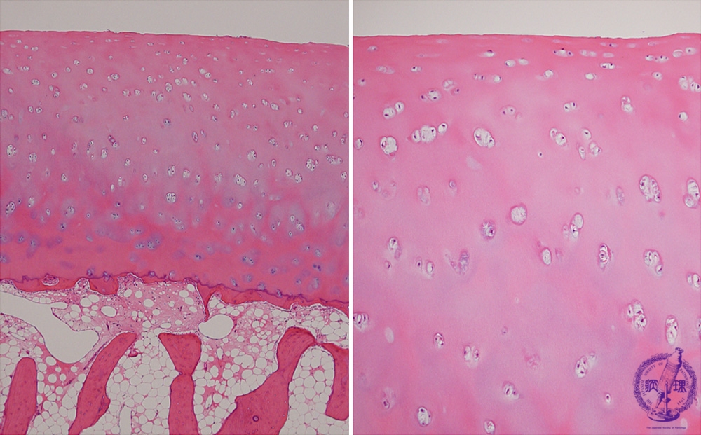 Microscopic view (HE; left-low power view,right-high power view): Histology of normal joint cartilage. Surface is smooth, and chondrocytes are evident at the lacunae, until near the surface.