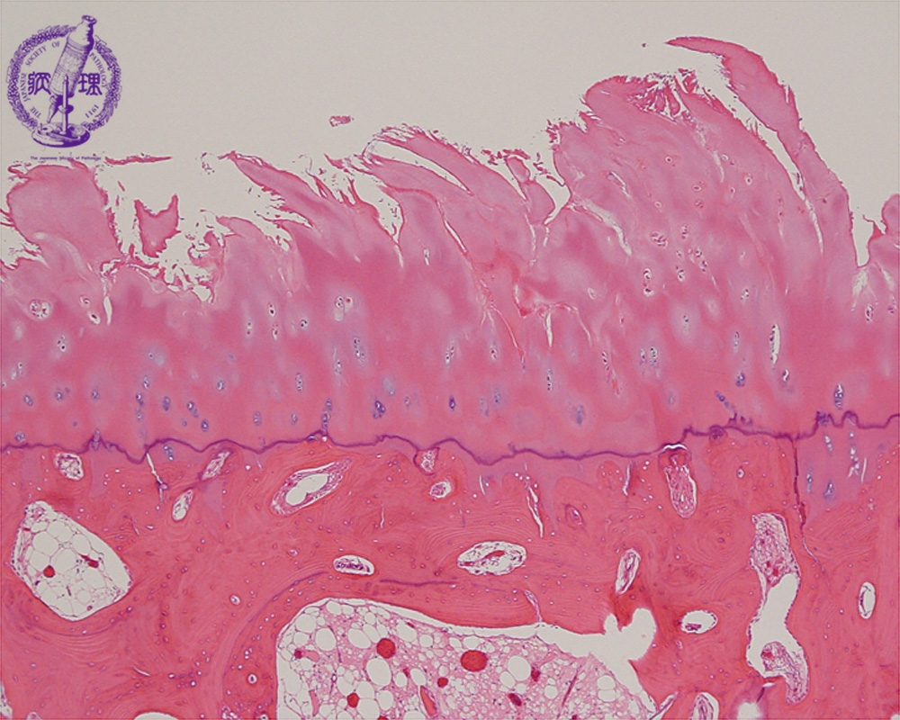 Microscopic view (HE; low power view): Joint cartilage at the rough part. The surface of joint cartilage shows fibrotic change and fissuring. Compare to normal joint cartilage.