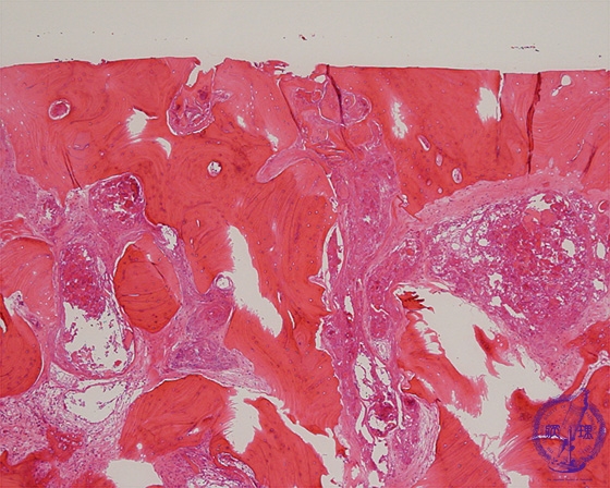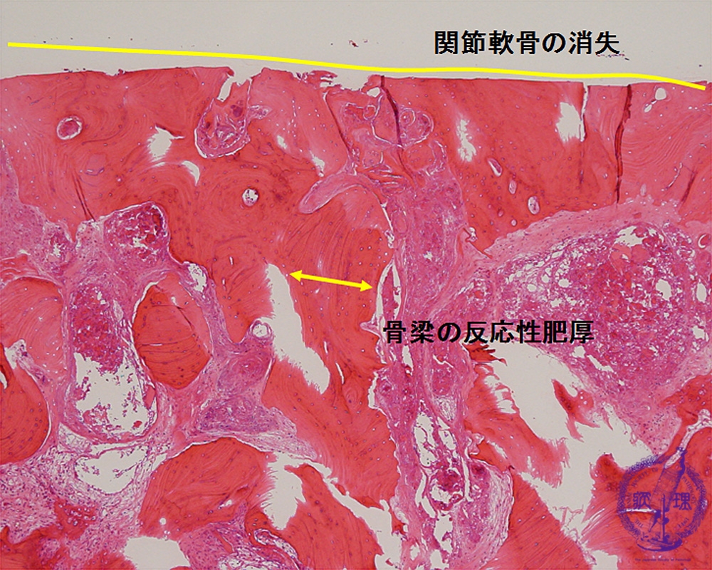 Microscopic view (HE; low power view): The area of exposed bone: Joint cartilage has completely disappeared, and underlying bony trabeculae are thickened. Compare to normal joint cartilage.