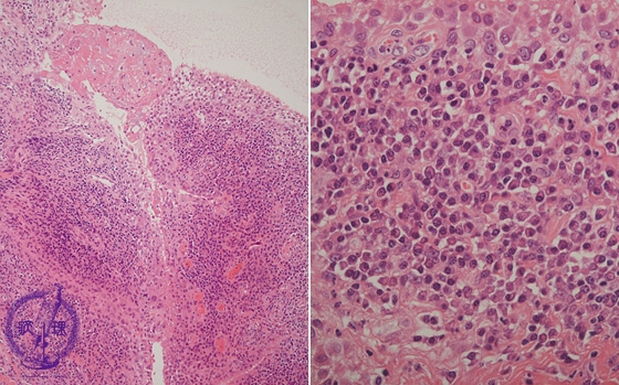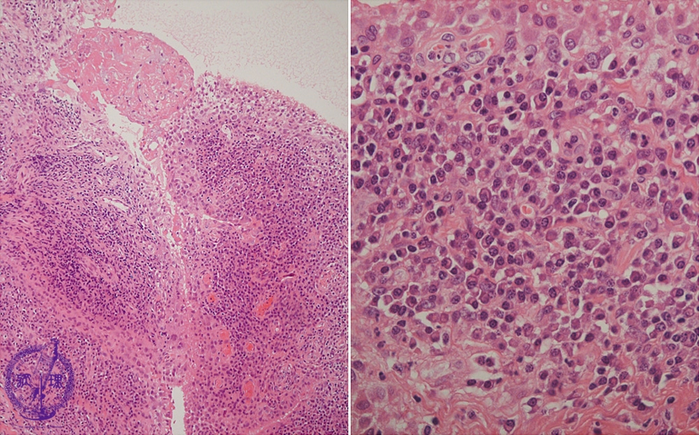 Microscopic view (HE; left-middle power view, right-high power view): Proliferation of stratified synovial cells and fibrin deposits on the surface. Among inflammatory cells, plasma cells are prominent.
