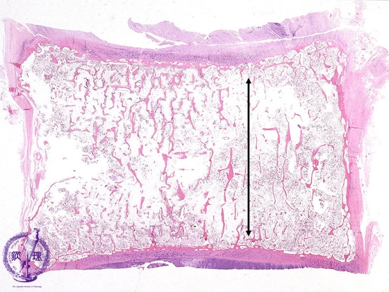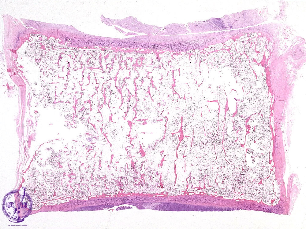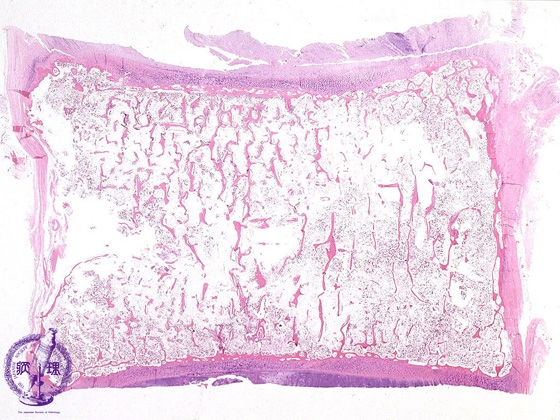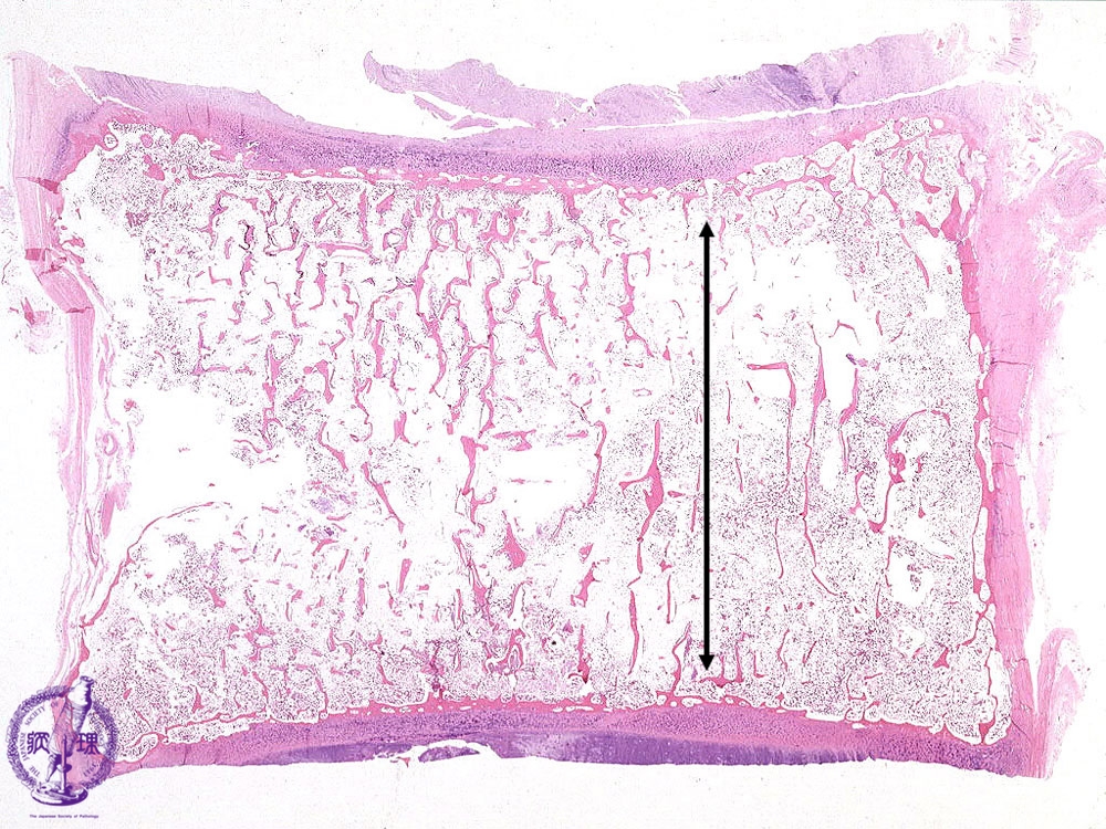 Microscopic view (HE; Loupe): Loupe view of HE stain slide or vertebral bone. Only bony trabecular of vertical direction are seen.
