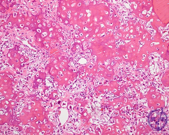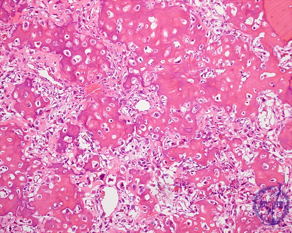Microscopic view (HE; middle power view): Tumor cells with abundant hyperchromatic nuclei form eosinophilic amorphous osteoid.