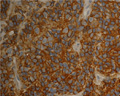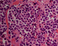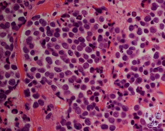 Microscopic view (HE; high power view): Tumor cells are round, nuclear chromatin is fine, and nucleoli are inconspicuous.