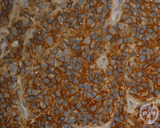 Microscopic view: CD99 (MIC2 gene products) immunostain: Strong positivity on the cell membrane of tumor cells.