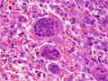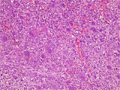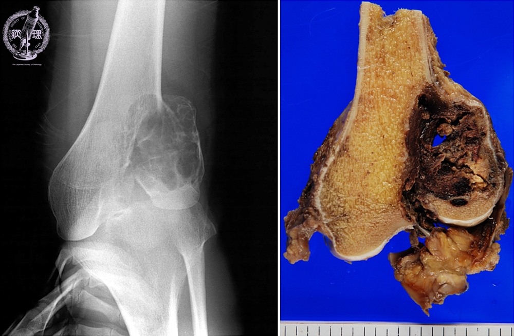 X-ray findings (Left) and macroscopic view (Right): X-ray shows bubbly shadow at the epiphysis. Macroscopic finding is concordant, showing circumscribed, hemorrhagic lesion.
