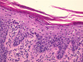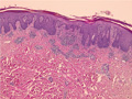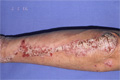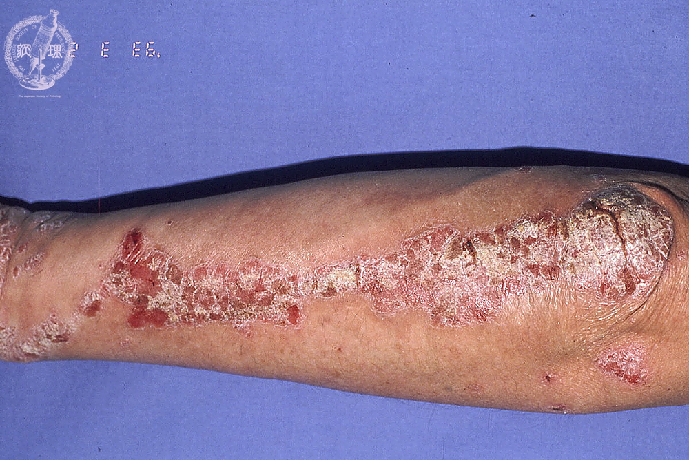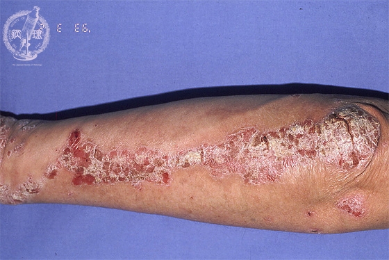 Macroscopic image: Characteristic well-circumscribed erythematous plaques with silvery scale areseen in the flexual areas of the elbow, knee and buttock. The lesions are not itchy.