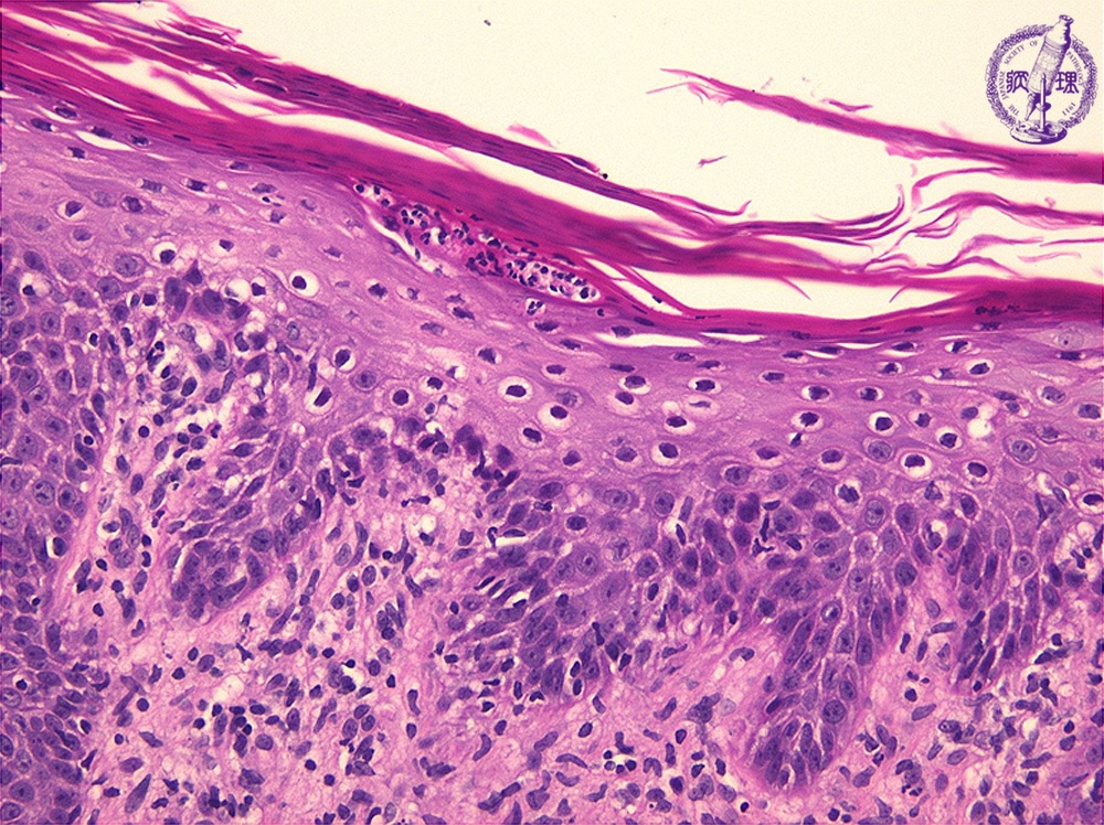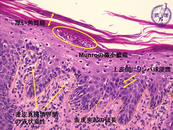 Microscopic image: Epidermis shows hyperkeratosis with aggregation of neutrophils (Munro’s microabscess)