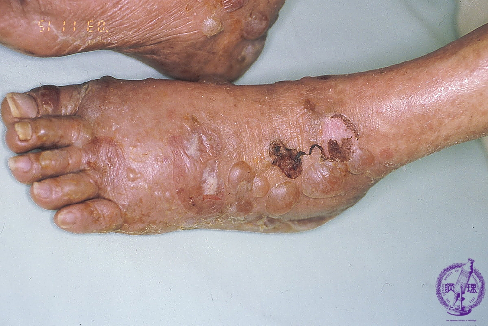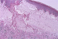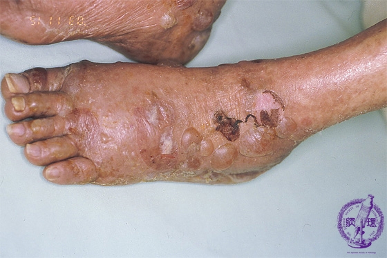 Macroscopic image: Bullous pemphigoid commonly occurs in or after the 7th decade. Tense bullae with erythema are seen. This disease is sometimes associated with visceral malignancy.