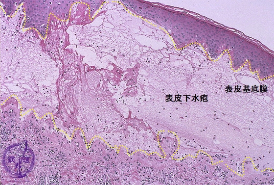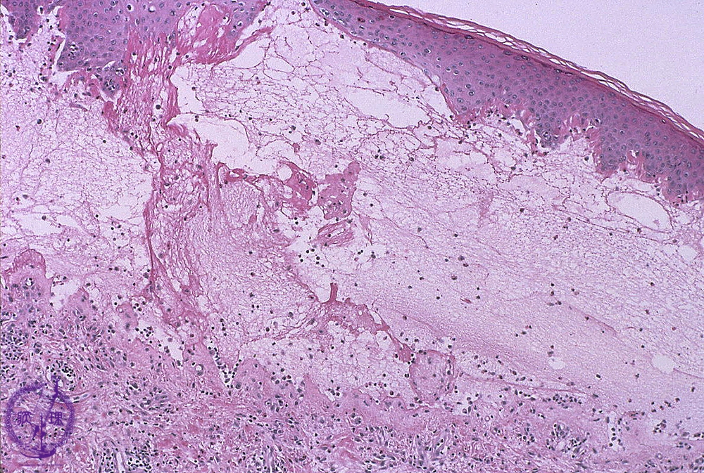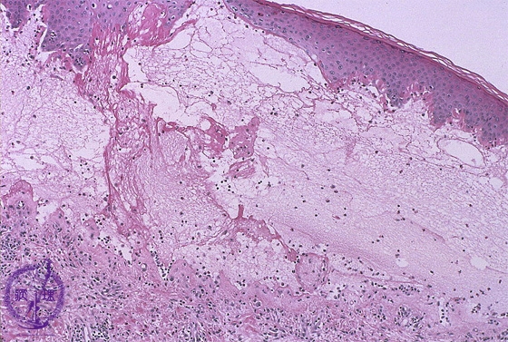 Microscopic image (Bullous pemphigoid): Fibrin deposition and numerous eosinophils are seen in the blister cavity. Eosinophil infiltration is also seen in the superficial dermis.